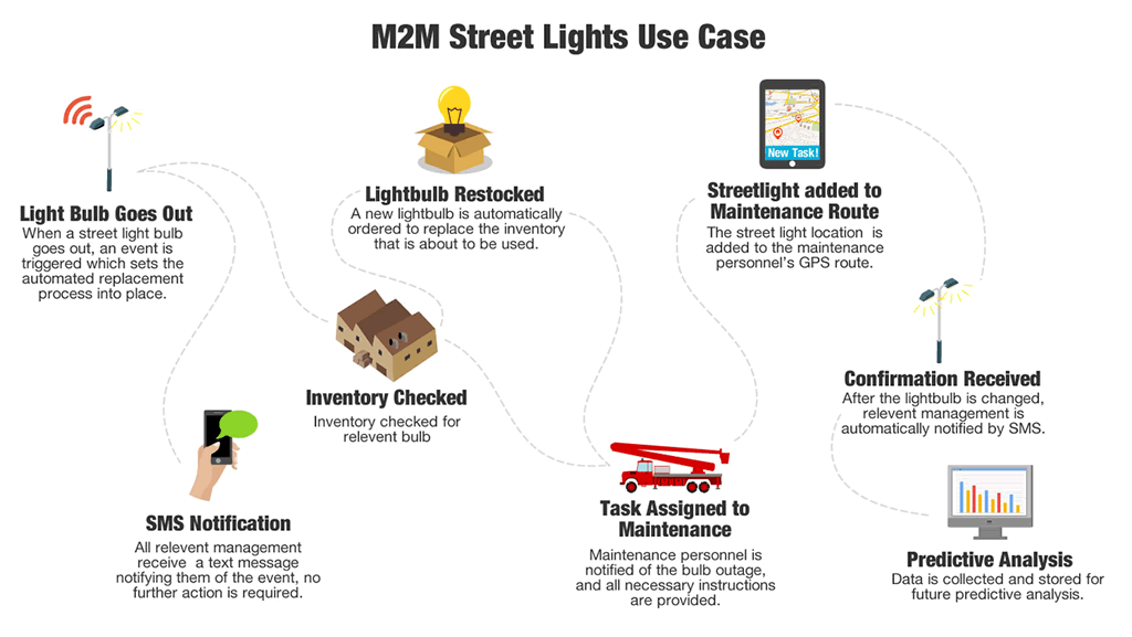 Implementing smart light bulbs into street lights can drastically improve a city’s ability to maintain optimum uptime for lighting city streets. For example, a light bulb could send a notification when it is about to go out, nearing the max threshold of hours in use or when it actually does go out. This notification can be sent in form of an SMS to a maintenance crew to go replace the bulb or in form in a work order inside a maintenance ticket management system. The event could also trigger for the warehouse to pull a new bulb from inventory and place onto the maintenance truck. The crew then replaces the bulb shortly after the alert went out that the bulb had failed. Furthermore, data can be collected on how long the bulb was in operation so predictive analysis can be used to predict when other light bulbs may be nearing a faulty stage.